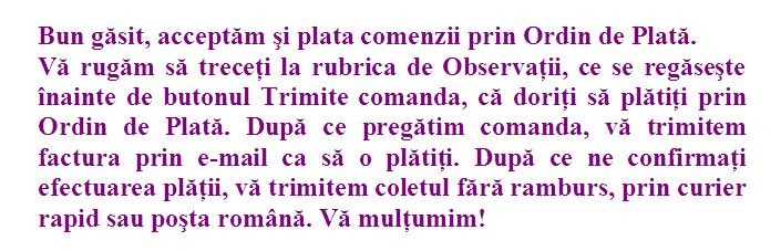 Reduceri de prețuri! | | Majoritatea produselor beneficiază de reduceri de preț. În plus, taxele de transport (prin curier rapid sau Poșta Română) sunt achitate de noi pentru comenzile mai mari de 100 de RON! |