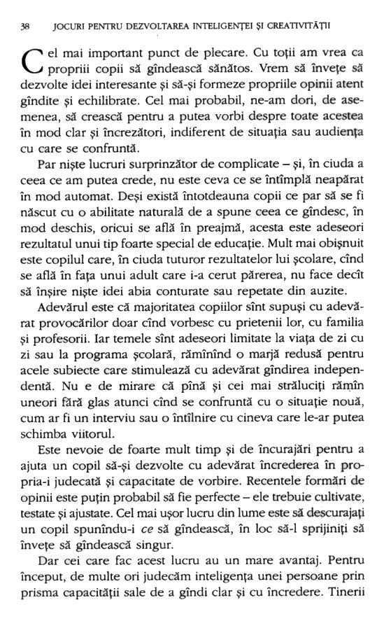 1. Cum stimulați gîndirea independentă ... 37 2. Cum dezvoltați o imaginație bogată ... 49 3. Cum poți fi atent și bun observator ... 6l 4. Cum stimulați o curiozitate arzătoare ... 79 5. Cum dezvoltați o abordare de tip "hai să aflăm" ... 89 6. Cum încurajați originalitatea și creativitatea ... 107 7. Cum să devii inovator și inventiv ... 121 8. Cum să descoperi puterea perseverenței ... 133 9. Cum vă asumați un risc potrivit ... 151 10. Cum să înveți din succese, dar și din greșeli ... 163 11. Cum să deosebești lucrurile cu sens de cele fără sens ... 175 12. Cum să gîndești flexibil ... 195 13. Cum să iei decizii înțelepte ... 207 14. Cum rezolvarea problemelor poate deveni o plăcere ... 215 15. Cum dezvoltați abilitățile sociale ... 235 16. Cum dezvoltați inițiativa și gîndirea anticipativă ... 245